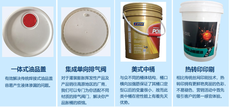我们为客户提供膨胀性液体的排气解决方案,解决液体肥料膨胀问题以及油品运往高海拔地区时的桶内压力变化问题;提供塑料制提手,握感更为舒适且承重能力大幅提高;一体式包围油品盖,解决传统焊接小盖渗漏问题;配套为客户提供桶身丝网印刷及更为高档的热转印印刷方案。